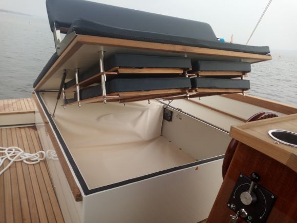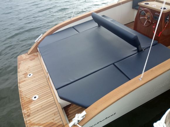 Da es keine feste Oberform gibt, kann der Aufbau des Decks bei Bedarf sehr individuell gestaltet werden. Neben den vielen Sitz- und Loungemöglichkeiten sind auch zwei Liegeflächen Teil des Konzepts. Achterlich kann diese durch einfach verstaubare Zusatzpolster deutlich vergrößert werden. Elektromotor und Batterien benötigen wenig Platz. So ist überdurchschnittlich viel Stauraum vorhanden. Versenkbare Klampen, optionales Teak und Mahagoni-Finish unterstreichen die elgante und zeitlose Linie für viel Freude und guten Werterhalt.