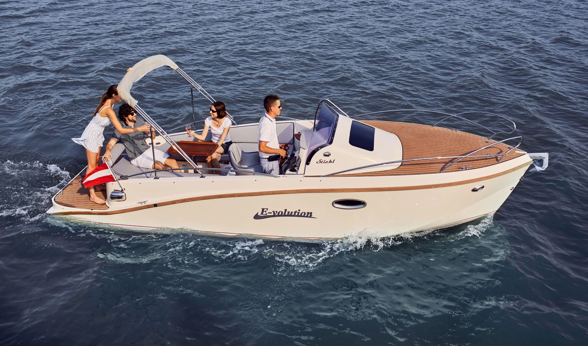 Die langezogene Wasserlinie der E-volution macht sie zu einem schnellen und sparsamen Verdränger in der Tour Version. Die Sport-Variante mit 19kW-Motor erreicht mit dem smarten Rumpfdesign sogar 20km/h. Es ist genug Platz zum Schlafen in der Kabine und in den großen Staufächern kann vieles untergebracht werden. Die verschiedenen Liegeflächen auf dem Bug, im Cockpit und sogar auf der Badeplattform bereiten für die ganze Crew (bis zu 8 Personen) relaxte Stunden.