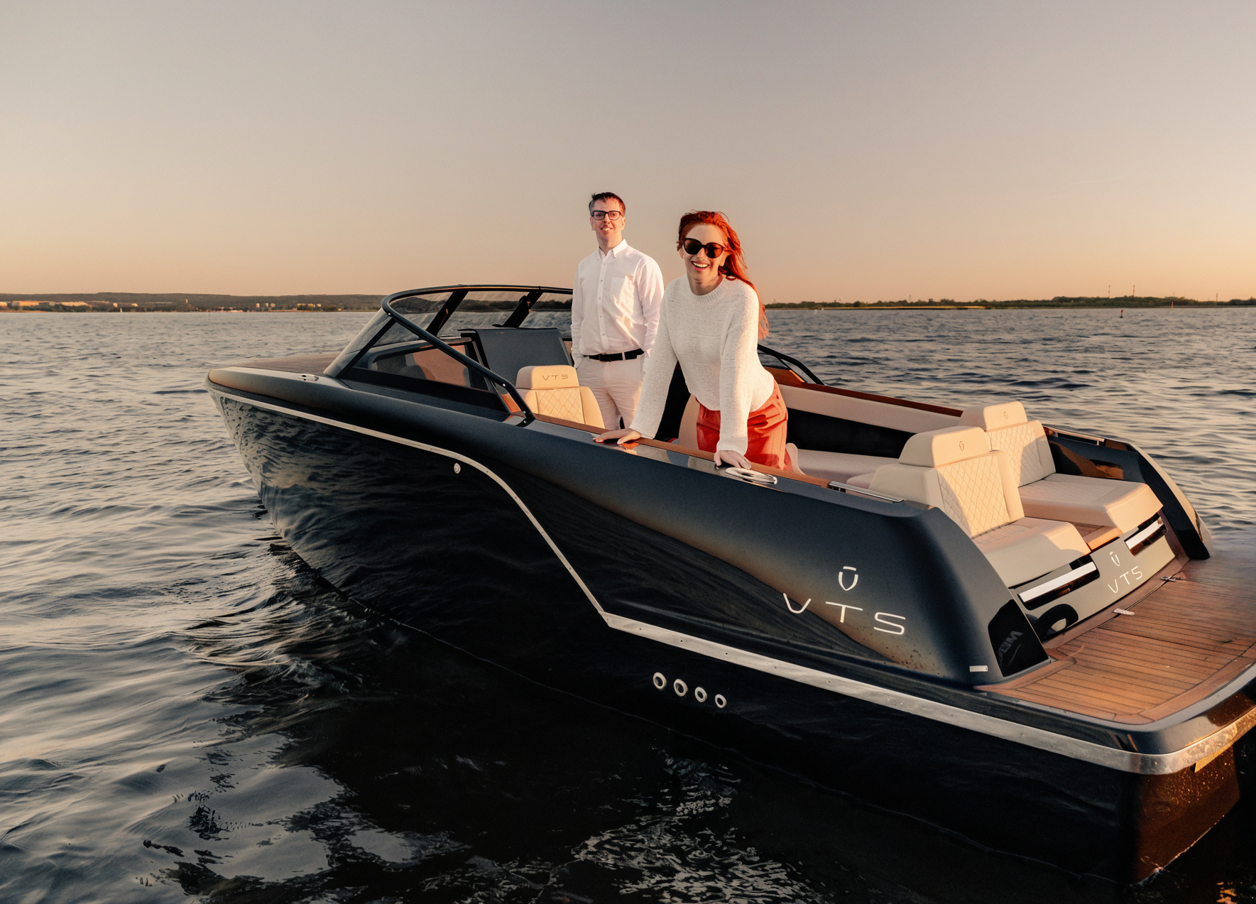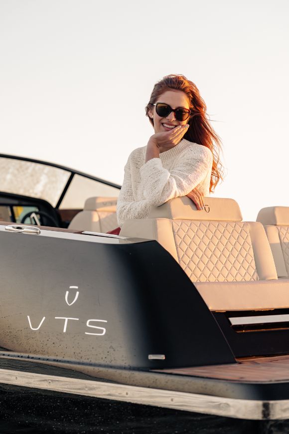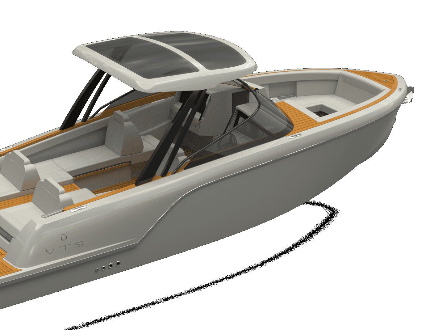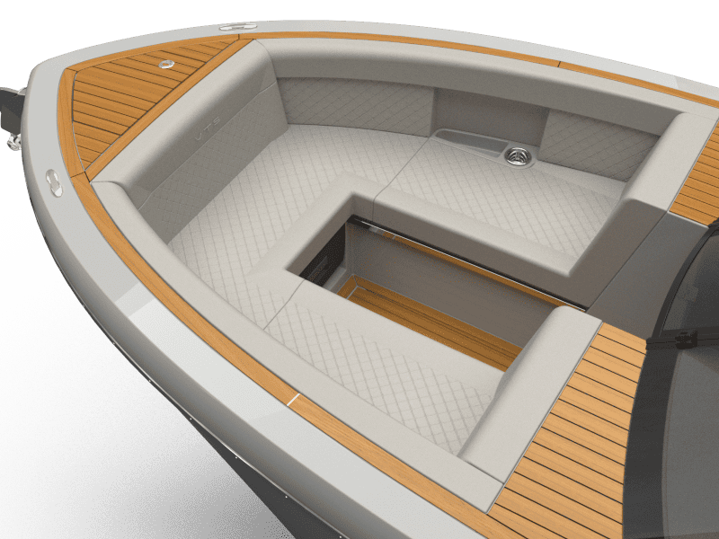 Ihre betörend sportlichen Kurven und präzise Fertigungsdetails sind eine Augenweide. Der Rumpf ist für die Elektroversion als Halbgleiter optimiert, hocheffizient und durch sein Design sehr kippelstabil. Auch mit weniger Leistung fühlt man sich in dem schnittigen Flitzer gut aufgehoben. Auf Wunsch gibt es auch Elektroantriebe für zügige Fahrt. So kann man das edle Ambiente wunderbar in stiller Fahrt genießen. Wer es doch nur sportlich mag, kann den Rumpf in der Gleiterversion wählen. Viele variable Sitz- und Liegemöglichkeiten mit raffinierter Kabine mit extra großem Bett und vielen Staufächern ermöglichen auch ein bequemes, langes Wochenende auf dem Boot. Sommertage und Sommernächte - mit Stil.